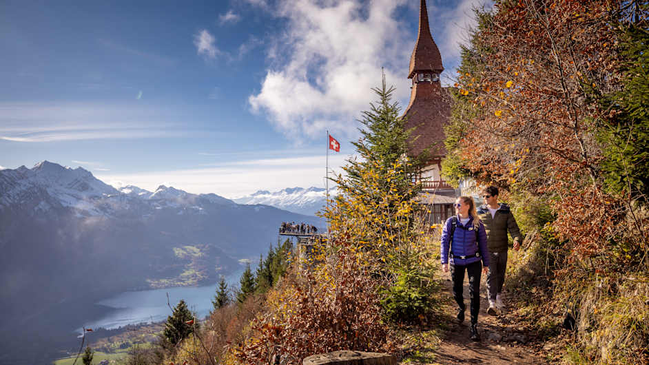 Your gaze drifts across Eiger, Mönch and Jungfrau – and far down to Lake Thun and Lake Brienz. It feels like a remote alpine dream. But it’s not: the Harder Kulm is just ten minutes from Interlaken.
